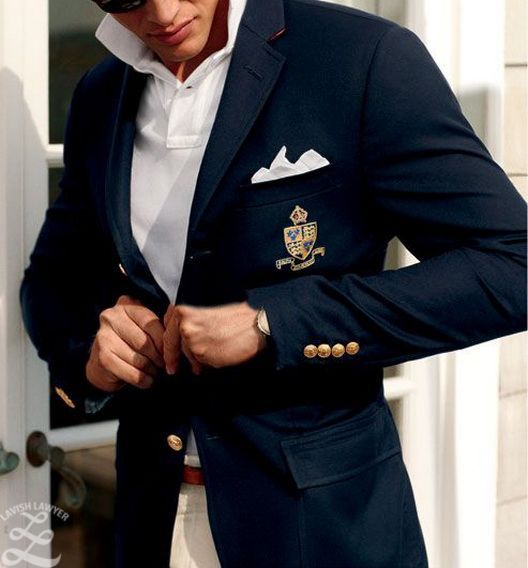 Блейзер имеет интересную историю, связанную со студентами Кембриджа и королевой Викторией, оба случая касаются военно-морского флота. Поэтому он выполнен в насыщенном синем цвете и украшен медными пуговицами с изображением якорей.