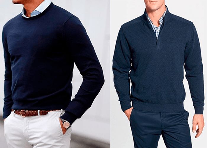 Обязательным атрибутом в мужском гардеробе Business casual являются джемпера. Идеальный вариант модели на пуговицах и без них, с V-образной и круглой горловиной, под горло для прохладного времени года. Свитер согревает, прекрасно сочетается с рубашкой, пиджаком, кардиганом и пальто.