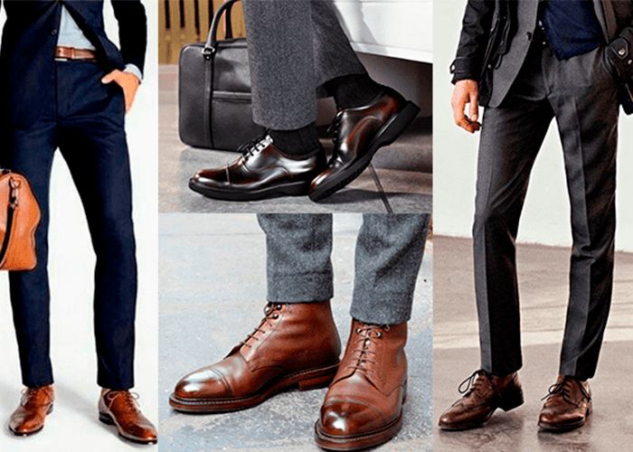 | Обувь | Оксфорды, дерби, лоферы; из кожи или замши; темных или коричневых тонов | Кроссовки, сандалии, ботинки грубой выделки |