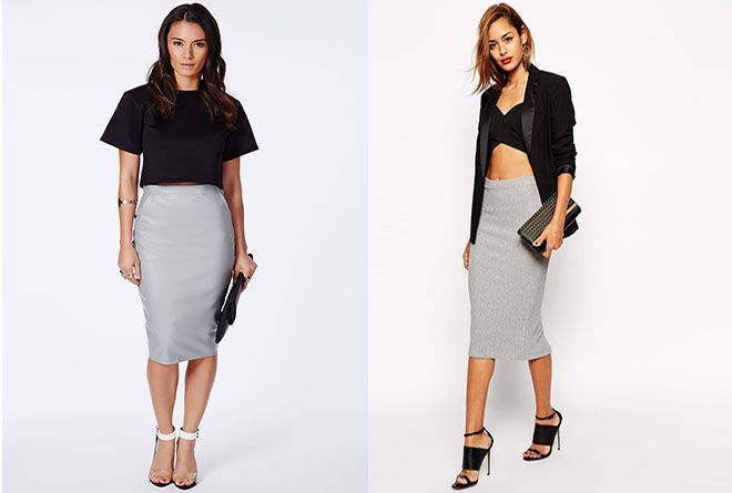 - Черная или серая юбка-карандаш хорошо смотрится только с обувью на каблуке. Если высокие шпильки не подходят, выбирайте обувь средней высоты — сапоги, туфли или босоножки.
