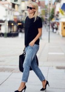 Классическим вариантом сочетания считается черная футболка с джинсами прямого кроя.
