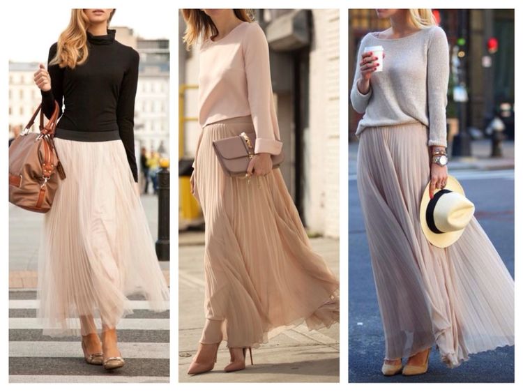 На фото видно, что бежевые юбки средней длины и мини смотрятся не менее романтично, чем варианты в пол. В первую очередь, кружевные или плиссированные модели длиной до середины икры. Можно дать волю фантазии и поэкспериментировать с верхом. Универсальное решение — обычный белый топ или актуальный сейчас кроп-топ. Яркими будут сеты с оранжевыми, коралловыми, синими топами и блузками. Также можно накинуть кардиган или косуху.