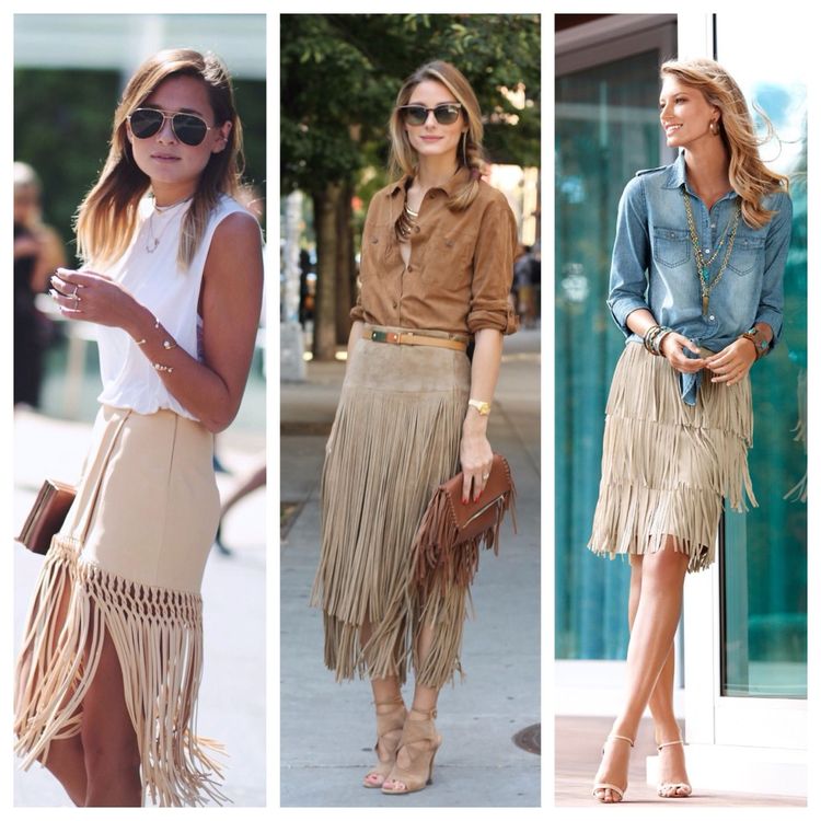 Универсальное решение — обычный белый топ или актуальный сейчас кроп-топ. Яркими будут сеты с оранжевыми, коралловыми, синими топами и блузками. Также можно накинуть кардиган или косуху. Если возник вопрос, с чем носить бежевую юбку-колокольчик, то стоит вспомнить о полупрозрачных блузах.