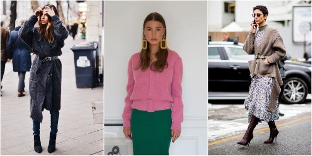 Большинство моделей кардиганов прекрасно выдержат соседство с ремешком. Выбирайте пояс на свой вкус: близкий по цвету или контрастный, тонкий или широкий. Застегивайте его на талии или на бедрах. Особенно удачным этот трюк будет с объемными и достаточно толстыми кардиганами. Лучше всего не застегивать такую кофту на пуговицы, а запахнуть и подпоясать.