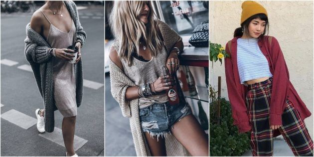 Сочетайте объемный теплый кардиган с платьем в стиле белья, мини-шортами, укороченным топом или другой неожиданной одеждой. Интересные контрасты создадут и текстуры: грубая шерсть отлично дополнит нежный шелк.