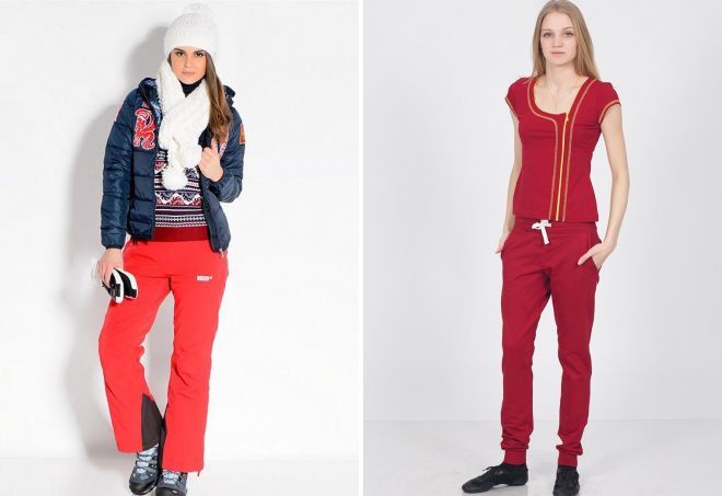 Яркая женская палитра стала популярной в спортивной моде. Спортивный стиль часто комбинируется с другими направлениями, что сделало красные спортивные брюки актуальным трендом на каждый день. В теплое время года особенно востребованы легкие трикотажные и хлопковые изделия. Одежда бывает как свободного, так и облегающего силуэта, с широким поясом-резинкой, регулируемым шнурком. Контрастный элемент в гардеробе освежит зимний образ. Хорошим выбором станут модели из плащевки, утепленные флисом.