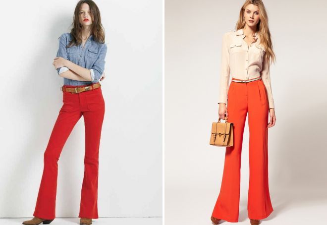 Расклешенный крой не только моден, но и помогает скорректировать пропорции фигуры. Девушка в красных брюках клеш выглядит женственно. Модели, расклешенные от бедра, подойдут для тех, кто хочет скрыть лишние сантиметры в области бедер. Для маскировки худых ног лучше выбрать варианты с расклешением от колена. В моде как стандартная длина, так и макси, закрывающие пальцы ног, а также укороченные модели, часто украшенные бахромой, вышивкой или орнаментальной окантовкой.