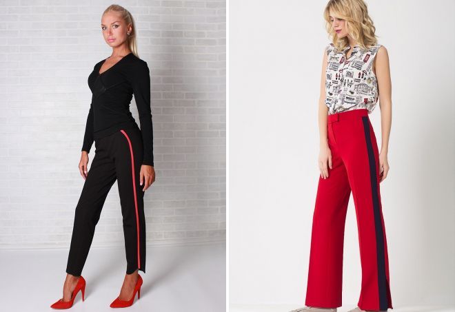 На однотонную яркую одежду решаются далеко не все модницы. Однако, учитывая, что в широком изобилии дизайнерских идей в женском гардеробе важно оставаться привлекательной и оригинальной, приходится искать стильные альтернативы. Модной находкой в коллекциях ярких штанов стали модели с красными лампасами. Контрастные боковые полоски отлично разбавят мрачный черный фон и добавят привлекательности скучным белым изделиям. Лампасы могут дополнять и стильные красные брюки. В этом случае уместны классические расцветки и вариант из прозрачной ткани.