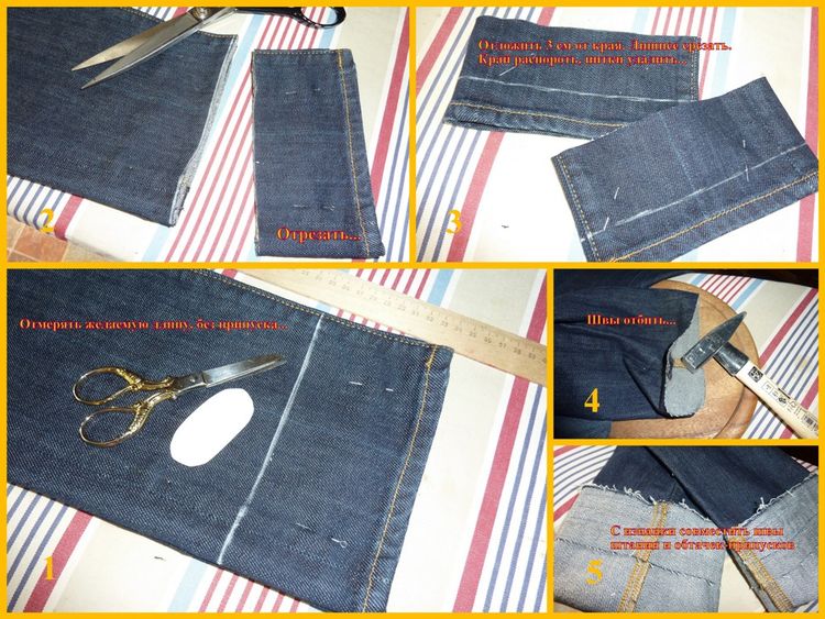 - нельзя игнорировать сметывание деталей для удлинения ткани джинсов, чтобы избежать морщин на стыке материй для элементов и денима брюк;