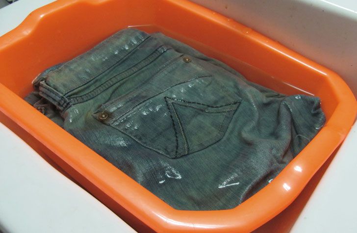 Домашний резервуар заполнить теплой (не горячей!) водой, добавить 1 колпачок шампуня и слегка перемешать. Постиранные и высушенные джинсы погрузить в раствор полностью и оставить так на 30 минут минимум. По истечении времени штаны вытянуть из емкости, подождать, пока стечет вода, но не выкручивать их.