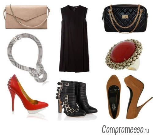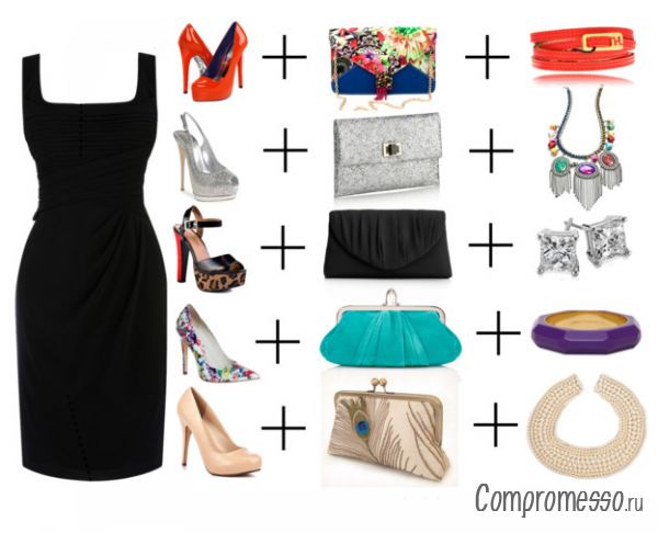 Маленькое черное платье отлично сочетается как с элегантными лодочками на шпильке, так и с яркими туфлями. Однако обувь насыщенных оттенков уместна только при простом и лаконичном фасоне платья.