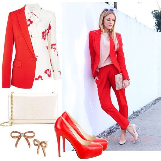 - С чем носить синий брючный костюм (а также алый или другого чистого насыщенного цвета) – с черным или белым «низом». Вместо чистого белого можно попробовать взять светлый перламутрово-серый или экрю.