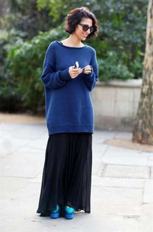 Синий свитер стал хитом, особенно в сочетании с юбками разных оттенков и текстур. Юбки могут быть однотонными или с узорами, каждая из них подчеркивает свитер, создавая уникальный стиль.