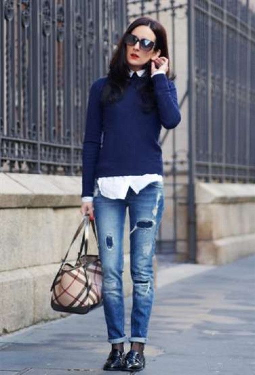 Например, низким девушкам идеально подойдет следующая версия: синий свитер с V-образным вырезом должен быть заправлен в брюки с высокой посадкой. В этой ситуации форма декольте визуально вытягивает фигуру, а благодаря соответствующим джинсам ноги кажутся длиннее.