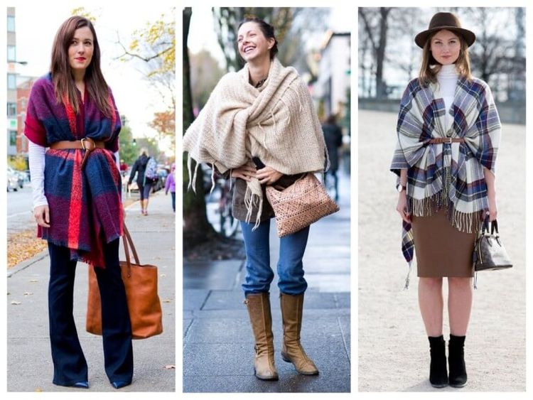Широкий шарф, накинутый поверх одежды, не только дополнительно согревает, но и добавляет образу женственности. Из тонкого шерстяного палантина можно соорудить подобие накидки, повторив алгоритм, представленный на фото ниже. Свободные концы завязывают сзади, а ткань драпируют по груди и плечам мягкими складочками.