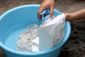 Загрязненную одежду замочите в теплой мыльной воде. Аккуратно потрите загрязненный участок, не прилагая усилий. Тщательно прополощите в чистой воде. Можно использовать кондиционер для белья. Сушите одежду в соответствии с характеристиками ткани.