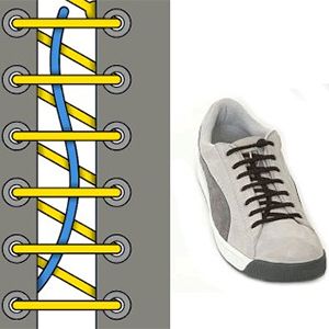 - Традиционный способ — в данном случае предполагается шнуровка обуви зигзагообразным путем, начиная с нижних отверстий, перекрещивания между собой концов шнурка, заканчивая процессом до последних отверстий.