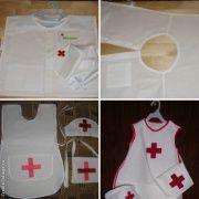 - Например, белая майка или футболка. Белый цвет является традиционным для профессии доктора. Так же отличительным знаком, является красный крест, который и необходимо разместить на одежде. Это может быть аппликация, вышивка, рисунок водостойким маркером или краской по ткани или наклейка.