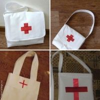- Второй вариант. Нам потребуется полоска ткани 80х30см и 10х100см. У широкой полоски ткани одну из узких сторон подгибаем и прокладываем строчку на машинке. Далее эту подготовленную сторону загибаем на расстоянии 25см на лицевую часть оставшейся ткани и прокладываем боковые швы. Затем у оставшейся части ткани подгибаем свободные стороны. Сумка практически готова. Остается лишь добавить ручку и если необходимо – застежку в виде пуговицы, липучки (контактной ленты) или кнопки. А так же сделать аппликацию в виде красного креста.