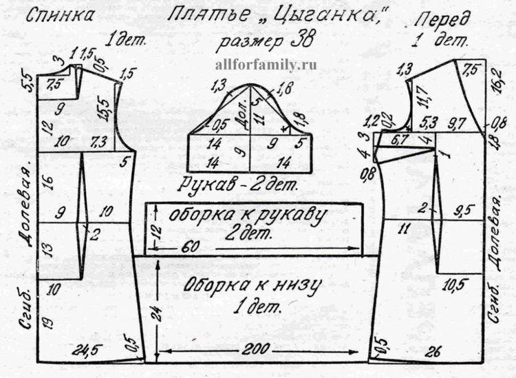 Создание костюма цыганки Начертите выкройку по схеме и перенесите ее на ткань. Вырежьте детали, оставляя 1-2 см на припуски для швов, затем сметайте и прострочите. Рукава и края можно отделать контрастной тканью для нарядности.