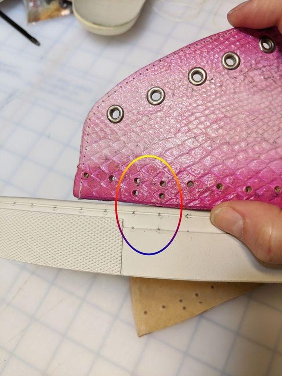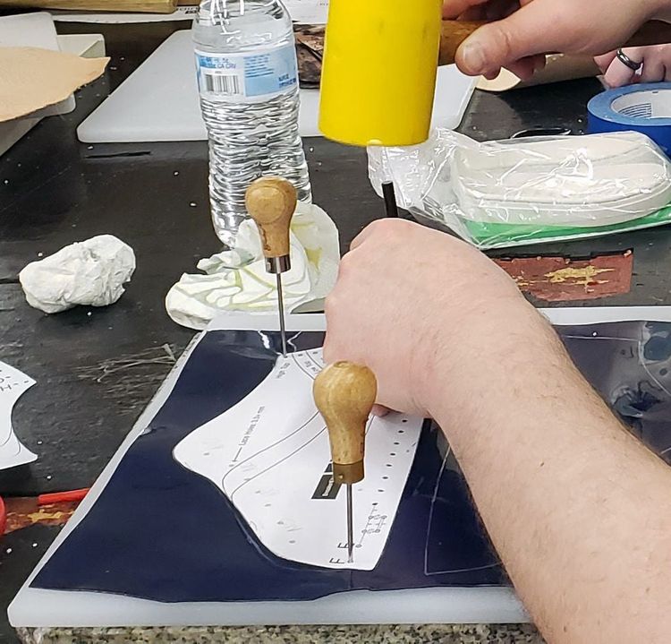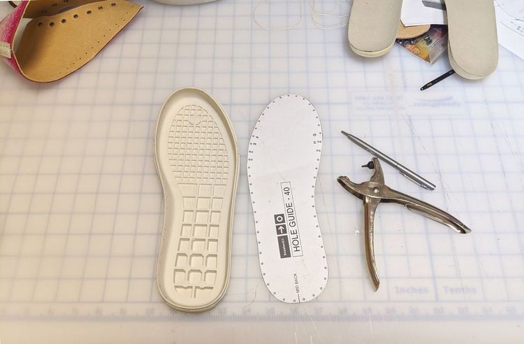 Сначала я отметил отверстия ручкой, а затем использовал шило, чтобы проткнуть материал. Небольшой совет: при использовании любого дырокола с отжимом добавьте небольшой кусок кожи на обратную сторону материала. Он будет служить амортизатором для дырокола и защитит от повреждения остальную часть подошвы.
