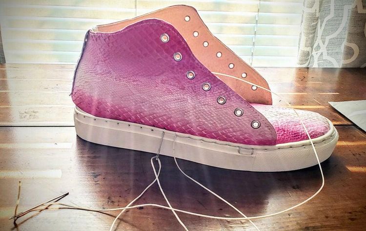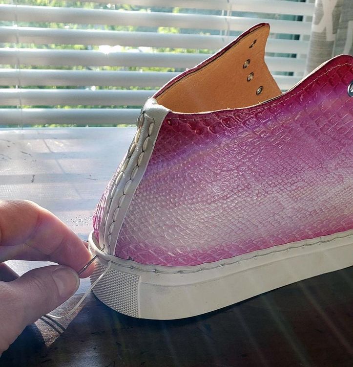 Самый простой способ быстро начать работу — купить полный комплект онлайн. Существуют готовые наборы, которые позволяют сделать DIY кроссовки быстро. Если же вы не можете приобрести его, то вам понадобятся следующие вещи: Вырезаем верхПервое, с чего стоит начать, — это верх кроссовок. Нарисуйте на бумаге шаблон, отталкиваясь от размера своей ноги. Лучше на несколько сантиметров увеличить длину. Например, у меня 39 размер, но я использовал шаблон для 40-го. После этого выберите стиль, который вам больше нравится, и вырежьте бумажный рисунок.Туго натягивайте нитку, вытягивая иглу из кожи после каждого стежка. Лучше сделать несколько швов — один над другим, это увеличит прочность. Когда вы приблизитесь к конце материала, сделайте несколько стежков назад. Возьмите иглу и протолкните ее на другую сторону. Натяните нить очень плотно, а затем сделайте узел и отрежьте оставшийся кусок. Также вы можете шить сразу двумя иголками в одном направлении. Как создать обувь своими руками