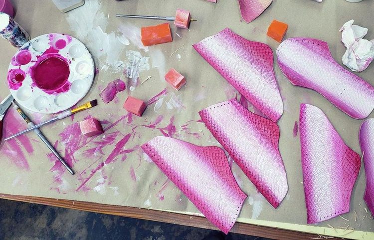 - Чтобы вырезать детали используйте ножницы или универсальный нож. Чтобы не повредить поверхность подложите под него разделочную доску. Также на этом этапе вы можете рисовать или обрабатывать кожу, если вы хотите изменить ее цвет или сделать пару обуви более оригинальной. Если нет, то переходите к следующему шагу.