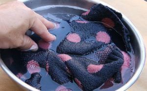 Если вещь сильно загрязнена, добавьте в воду мыльную стружку и 2 столовые ложки нашатырного спирта. Тщательно перемешайте и влейте в таз с водой. Этот метод особенно эффективен для белых тканей, на которых заметны даже небольшие загрязнения.