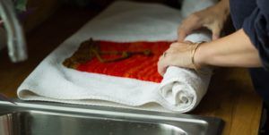 Чтобы сохранить форму изделия, важно правильно отжать влагу. После стирки разместите шапку на полотенце подходящего размера и аккуратно сверните в рулет. Отожмите полотенце, чтобы оно впитало воду, не растягивая шапку. Рекомендуется использовать махровое полотенце из-за его впитывающих свойств.