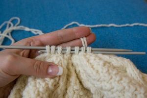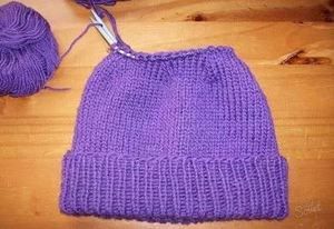 - Для объемной шапки после резинки добавьте одну петлю через каждые пять петель, затем продолжайте вязать узор.