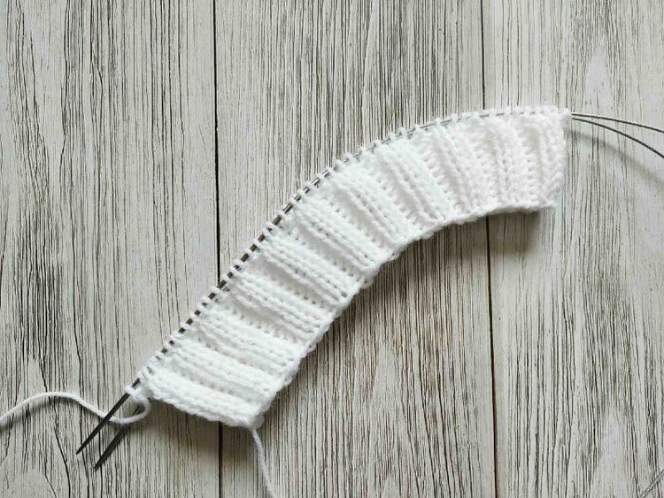 - Вязание выполняется резинкой, чередуя 2 лицевые и 2 изнаночные петли, начиная снизу.