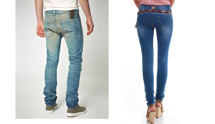 Эти особенности связаны с анатомическими различиями мужчин и женщин. У женских моделей при складывании брюк пополам видно облегающий силуэт в форме полумесяца с изогнутыми линиями, тогда как у мужских джинсов покрой не имеет таких ярко выраженных изгибов.