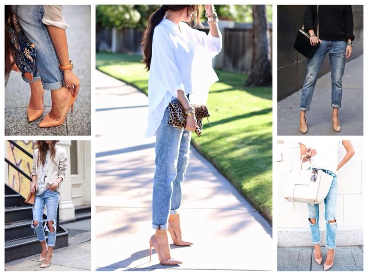 Бежевые туфли на каблуке отлично смотрятся с узкими джинсами и легкой блузой под кардиган. Джинсы могут быть любого кроя, главное — чтобы они хорошо сидели.