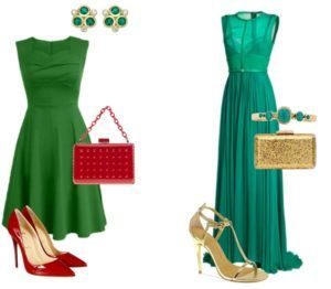 Нейтральные цвета: нейтральные цвета, такие как белый, чёрный, бежевый и серый, идеально подойдут для создания баланса с платьем насыщенного зелёного цвета. Природные тона: коричневый, терракотовый, бордовый, а также фиолетовые в холодных тонах. Пастельные цвета: мягкие тона, такие как лавандовый, бледно-розовый или небесно-голубой, смягчают воздействие зелёного.