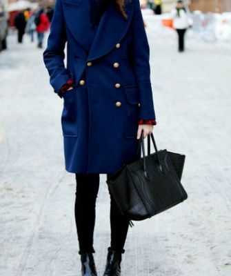 Ткань пальто также важна. Твид, шерсть или кашемир отлично дополнят замшевая или кожаная сумочка. Недорогие ткани будут выглядеть более «благородно» в таком сочетании. Для синего пальто строгих правил по выбору сумки нет. Полагайтесь на интуицию и чувство стиля! Яркие акценты, такие как желтый, золотистый, изумрудный или красный, будут отличными вариантами.